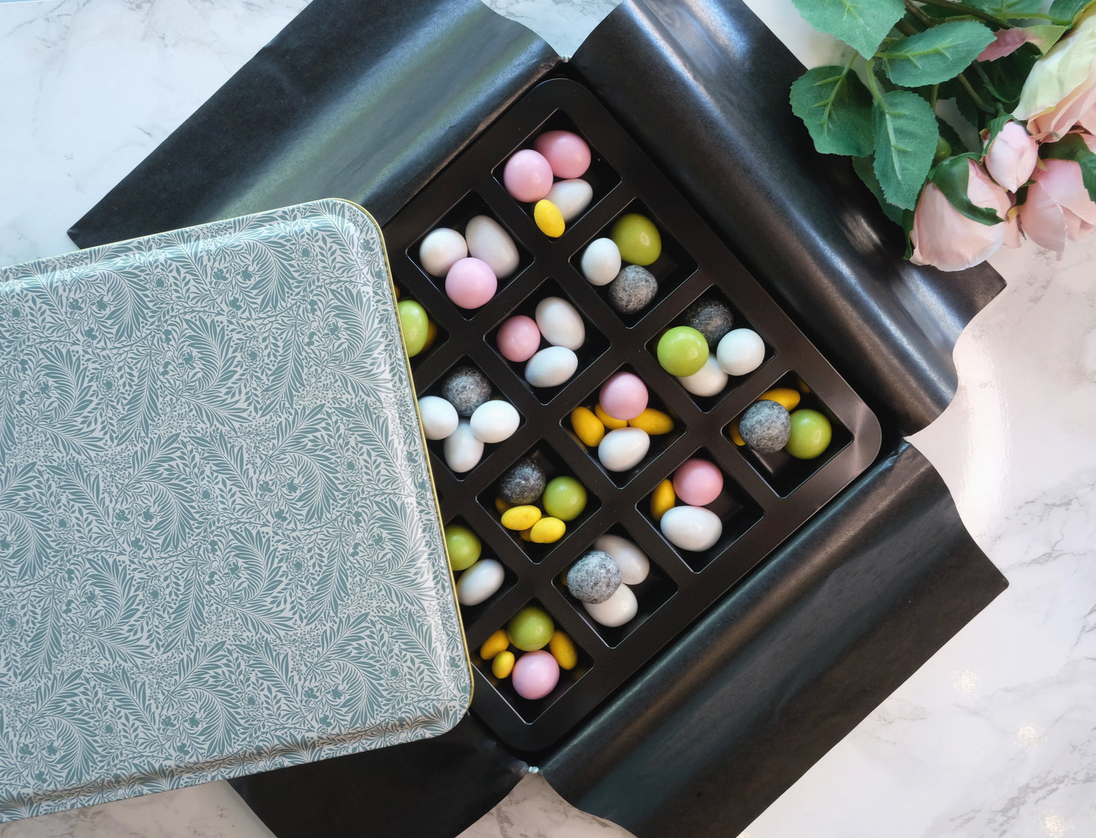 Toasted almonds wrapped in dark, white and hazelnut chocolate